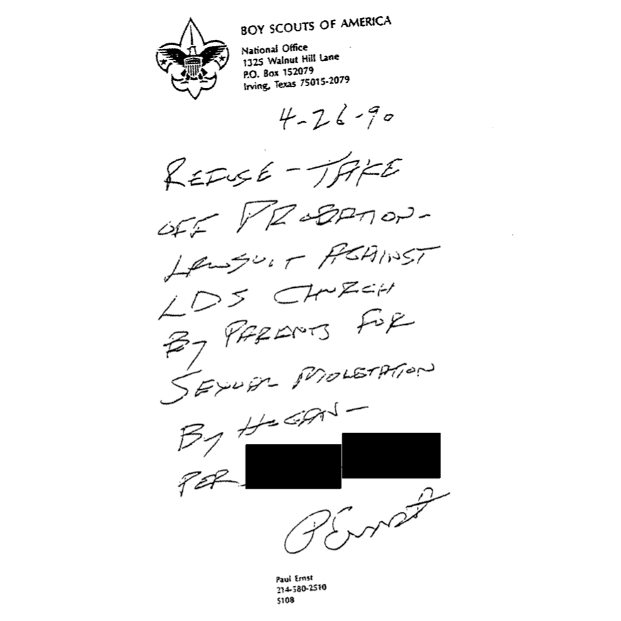 4-26-90 – Refuse – Take off probation – Lawsuit against LDS church by parents for sexual molestation by Hogan – per [redacted] – P Ernst