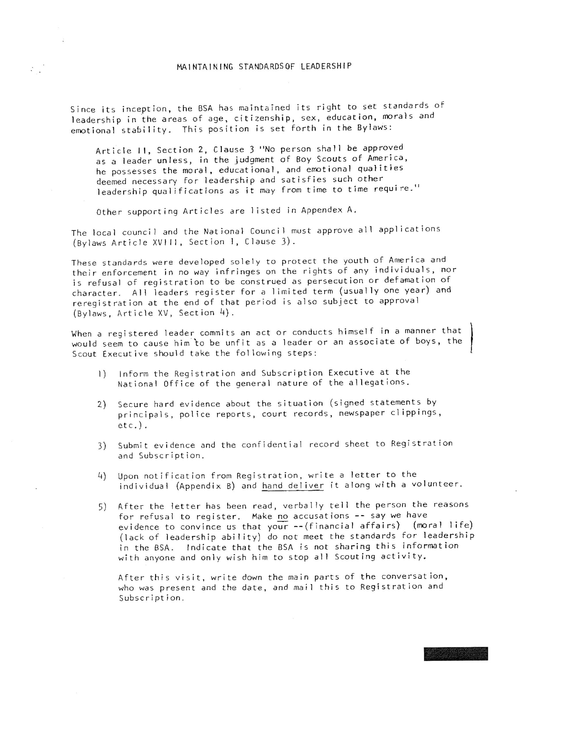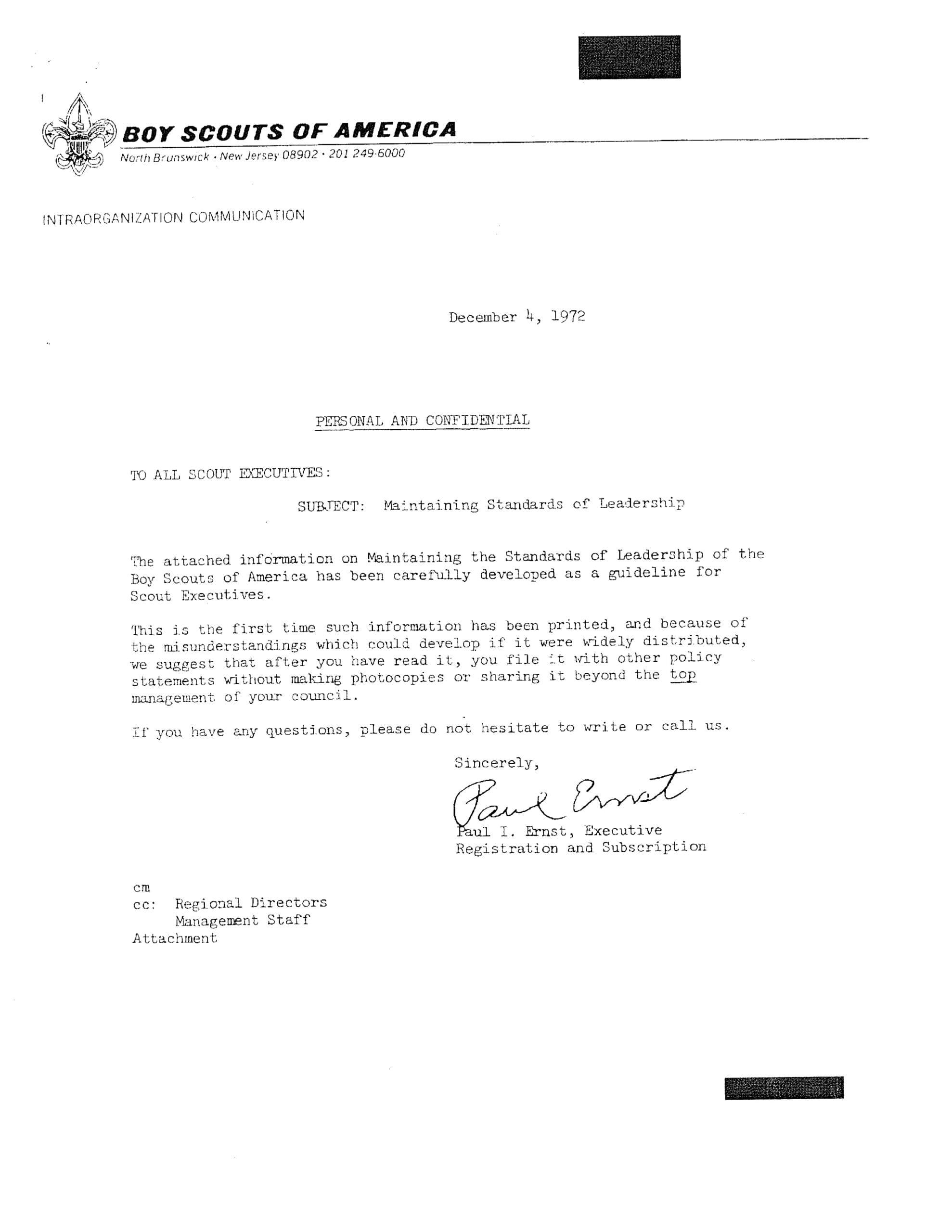 In 1972, Ernst sent written instructions to all professional Scout executives (regional paid staff managing Scouting) on what to do “when a registered leader commits an act or conducts himself in a manner that would seem to cause him to be unfit as a leader or an associate of boys.”