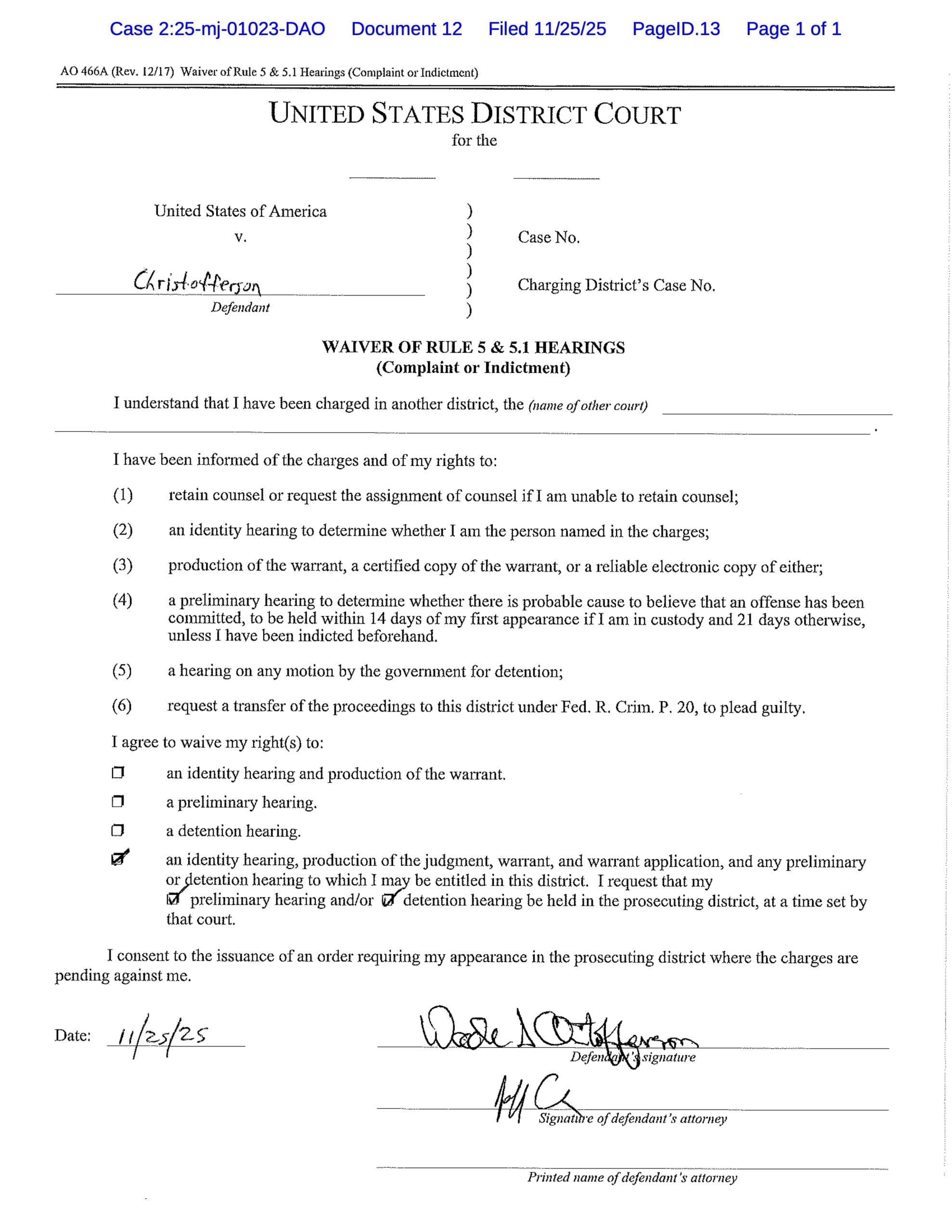 Wade Christofferson Waiver of Rule 5(c)(3) Hearing – Nov. 25, 2025